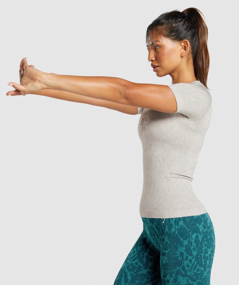 občutite, Da Vas Navdihuje Brezšivna Majica Z živalmi. V Laskavem Kroju S Popolno Pokritostjo Se Lahko Počutite Udobno Dvigniti Višje Kot Kdaj Koli Prej. Brezšivni žakard, Ki Odvaja Znoj, Ovalni Izrez Na Zadnji Strani In Naborani Detajli Na Sprednji Strani Obljubljajo Podporo Vsakemu Vašemu Gibu.
